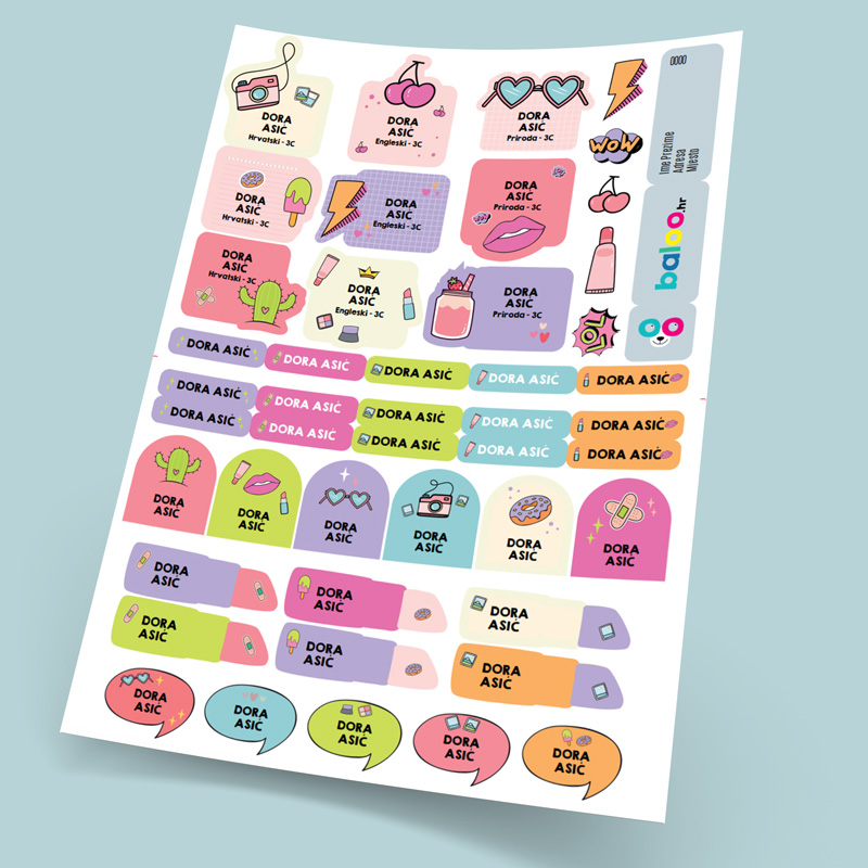 Paket School cool sadrži 164 personaliziranih naljepnica s imenom u pet različitih veličina i oblika – idealne za bilježnice, pernice, bojice, obuću i sve ostalo što djeca svakodnevno nose u školu.