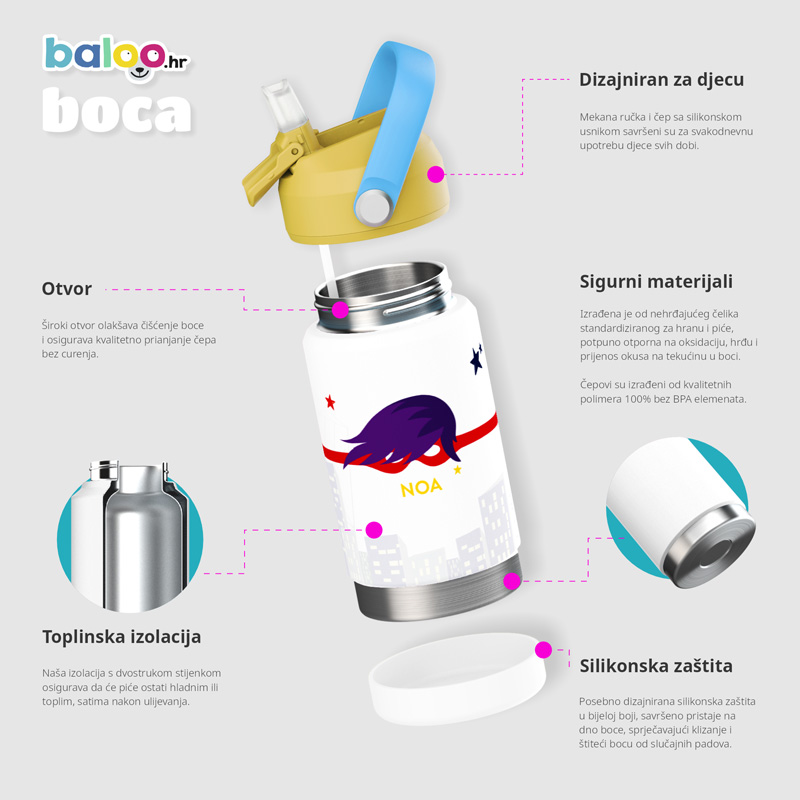 Posebno dizajniran čep za sigurno korištenje i lako otvaranje/zatvaranje, apsolutno nepropusna iz koje neće propuštati sadržaj! Prepoznatljivog Baloo dizajna s imenom Vašeg djeteta, beskompromisne kvalitete bez BPA spojeva s dvostrukom inox stjenkom, kapaciteta 350ml.